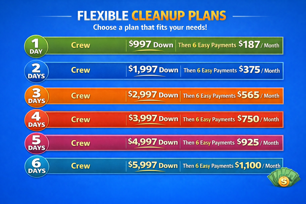 We understand that extreme hoarding cleanouts, advanced biohazard remediation, and deep home sanitation services are often unexpected expenses. By offering flexible installment options alongside pay-in-full savings, we provide clients with the choice that best fits their financial situation. Whether you prefer a discounted full payment or a structured cleanup payment plan beginning in 45 days, our goal is to make professional hoarding cleanup and home remediation both accessible and affordable.